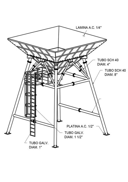 El cuerpo de la tolva se fabricará en lámina de 1/4", parte superior en angulo de 1/4" x 3", refuerzos en angulo de 1/4" x 2 1/2", refuerzos de los tableros en angulo de 1/4" x 2 1/2", las riostas en tubería sch-40 de 6" y 4" de diámetro, los parales verticales en tuberia sch-40 de 8" de diámetro, las cartelas en lámina de 3/8", repisas para colocar los parales verticales (patas) y las platinas en la parte inferior de las mismas en lámina de 1/2". Pasillo en lamina alfajor, baranda, parales de escalara en tubo de 1-1/2" y peldaños en tubo de 1" diametro. Todo esto debidamente pintado con anticorrosivo epoxico y acabado esmalte.